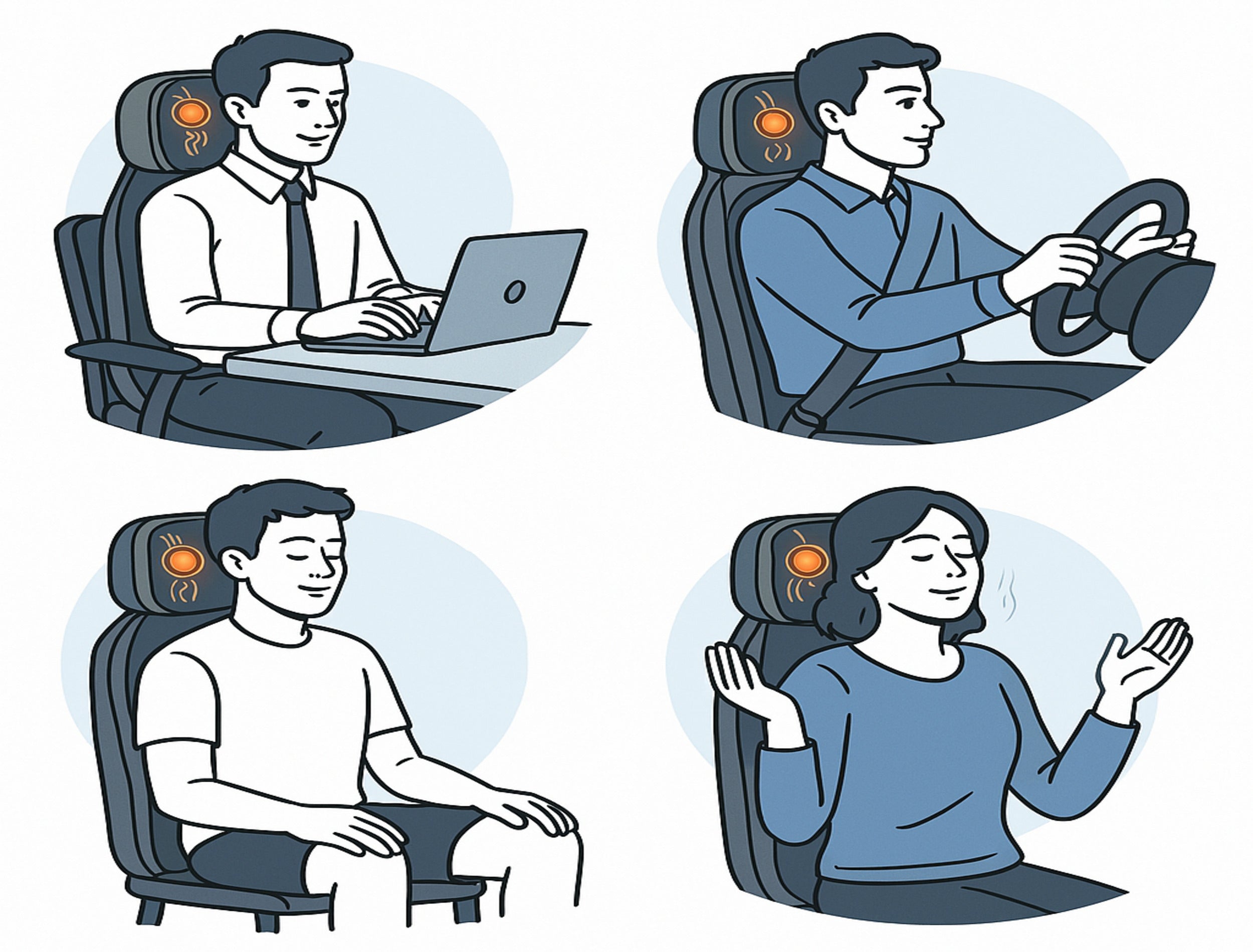 Muscle fatigue and improved blood circulation following prolonged sitting. Drivers who spend many hours on the road and travelers who make long trips can benefit from relieving tension and releasing accumulated burdens, which reduces the feeling of heaviness and helps improve overall alertness.